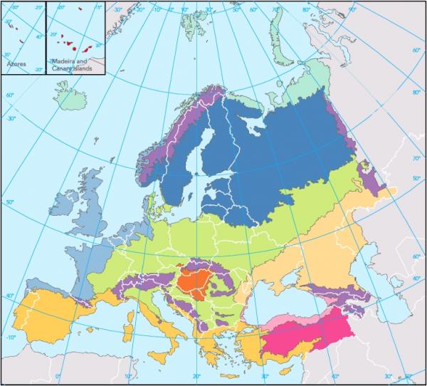 9 grandes régions biogéographiques ont été définies en Europe (l’intégration de la Roumanie et de la Bulgarie à l’Union Européenne rajoutera 2 nouvelles régions : Steppique et Littoraux de la mer Noire) :